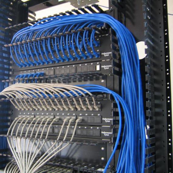 Paneles de empalme (patch panels) y cables de empalme utilizados para configurar las conexiones de cableado horizontal en el cuarto de telecomunicaciones.
